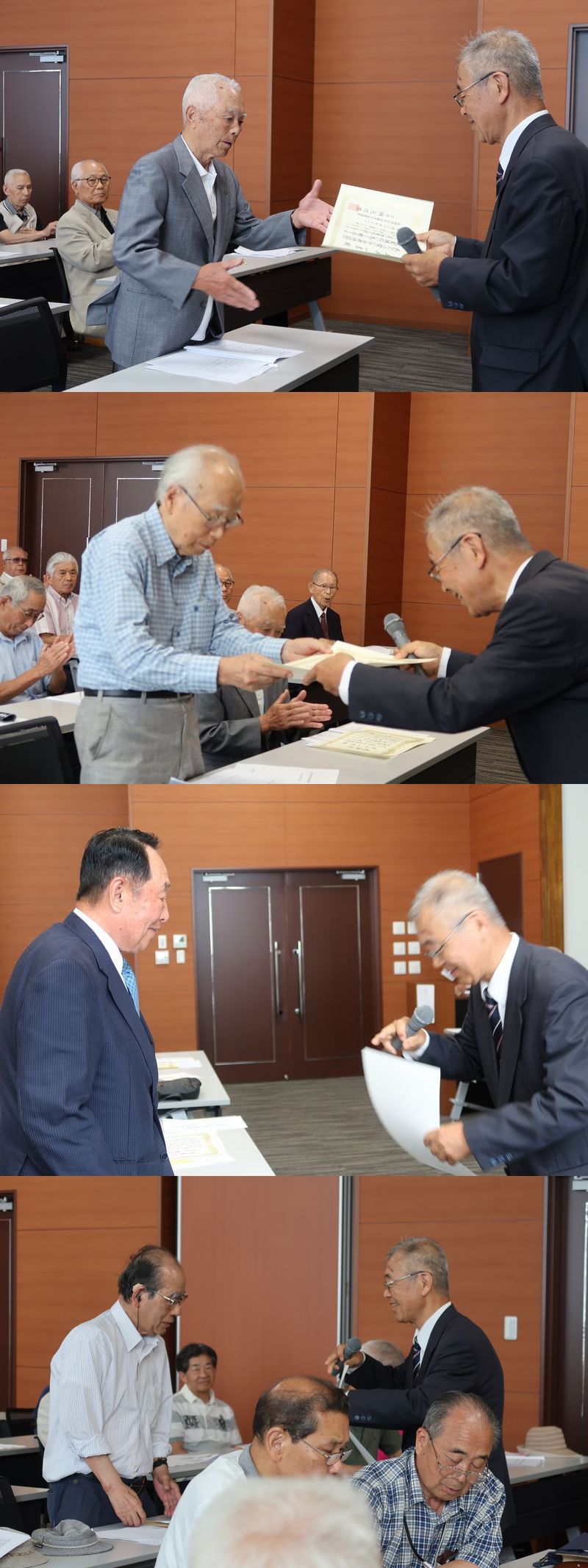 昨年13名の逝去会員への黙祷、21名の長寿会員祝贈呈(本人会員;卒寿5名、傘寿11名、米寿10名、喜寿13名、古希17名、遺族会員;卒寿2名、米寿2名、傘壽3名、古希2名)