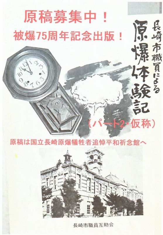 令和3年長崎支部は結成10周年被爆75周年記念事業として長崎市役所職員被爆体験記Uを発行しました。その後、記載漏れた被爆体験記が新聞などで発表されましたので" 2市2町 職員被爆体験記"=長崎市(含む・旧西彼杵郡香焼町,伊王島町,高島町,野母崎町,外海町,三和町,琴海町)西海市・時津町・長与町職員被爆体験記を募集し令和7年・被爆80周年記念事業として発行したいと企画しました。