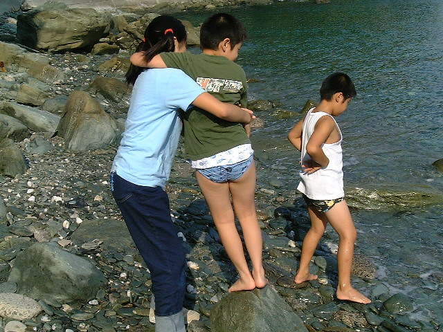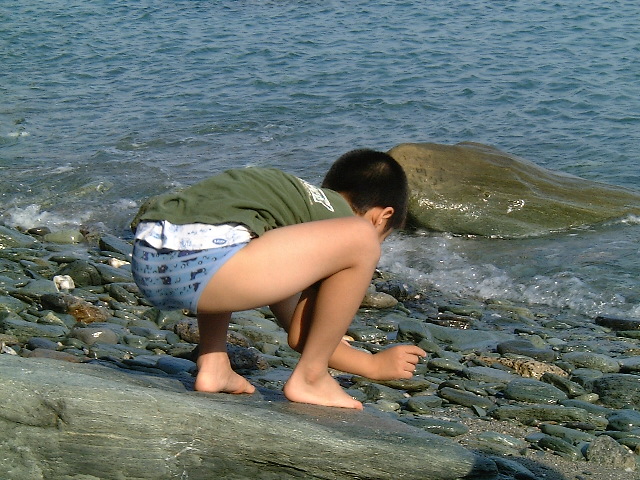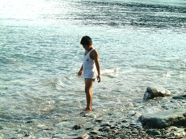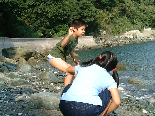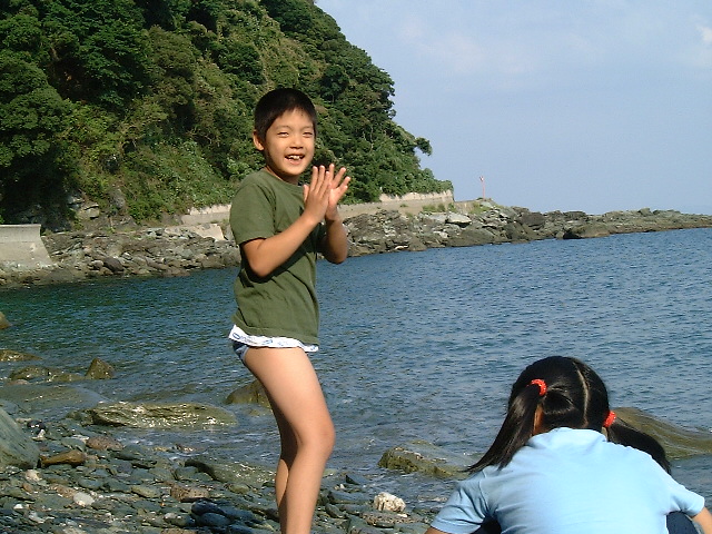 ここはパパさんのお母さん(おばあちゃん)の生まれ育った所です。 おばあちゃんのお兄さんやお姉さん達が暮らしています。 おうちから車で50分かかりますが、海と山に囲まれた 自然がいっぱいでとってもいい所です。 お墓参り みんなが元気でありますようにお守りください。 おおはしゃぎのかずくん 濡れるからくつした・ズボン脱いでね! 私どうしようかな?かずくんみたいに パンツにはなれないから靴下だけ脱ごうかな? 大ちゃんは波がうちよせると「怖いよ〜!」と 逃げ腰です。 やっと波にも慣れてきました。 海って不思議だな? よせたり ひいたり 海の音はどこかお母さんのお腹の中に似ている・・・ 生まれる前、この水の音に抱かれていたんだよね。 ヨ〜シ ぼくも石を投げるぞー! この石でいいかな? ほ〜ら 上手に投げられたでしょ! おまけだよ〜〜! |