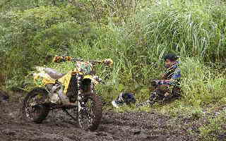 こないだ厄入りを済ませたばかりのイナバです。もうすぐ四十です。中年です。うれしいです。もうオマエも中年おやじの仲間入り チーム昭和寮のぼくしょう君から送ってきたわたしが黄昏てる写真です。レースが始まって1時間後突然エンジンストップ止まったのはここよりもっと上の方ですがひたすら押してここまで来てへばってたところです。このあともパドックまで押しましたがここで、泥で汚れたバイクを押して手伝ってくれたのがウサカメのかただったんですね。貴重な写真まで撮って頂いて恐縮です。しかしこのショット自分ながら哀愁を感じます。エンデューロおもしろすぎる、またいくぞ!