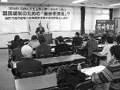 今通常国会で提案されようとしている「国民保護法制」は、実際は罰則付きで「戦前の国家総動員体制にもまして」国民を統制する中身であること、そのために自治体職員が駆り出されることになること、一連の「有事法制」は、実は財界・多国籍企業が世界進出を進める中で政府に要求してきたものであること、「有事」における徴用・徴発に用いる「公用令書」は書式がすでに完成していて官報で告示されたこと、etc...今のまま進んでしまうと日本の経済とわたしたちのくらしはどうなってしまうのか、この狭い紙面にはまったく書きつくせないほどの「事実」を明らかにしていただきました。