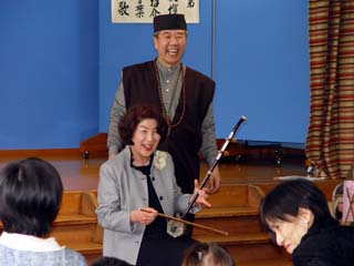 瓢箪笛を吹く園児、    園長先生も二胡に触れ、ご満悦!