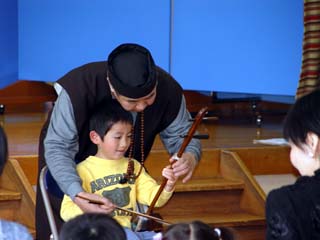 ピッコロ尺八に挑戦する園児、   二胡も弾けました!