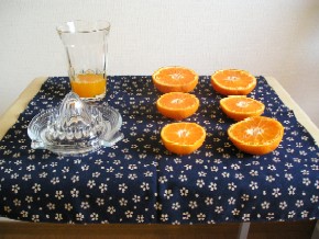 蜜柑は道端で売ってる一袋数百円のヤツ。それをテーブルにセッティングした最新式全手動型ジュース搾りマシーンを使って、まるで小作民から無理やり年貢を奪うように、はたまた年貢の肩に連れてきた娘をもてあそぶかのように「うりゃうりゃ、これでもか。もう逃げられはせんぞ!」とばかりに力ずくで搾り取る。そうやって集めたアスコルビン酸を、悪代官ムラキは腰に手を当て一気に飲干し、「これだから悪事はやめられんのう〜」と満足げに一人ほくそえむのであった・・・メデタシ、メデタシ。