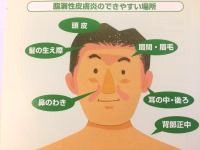 ヒトの体の中で以下の部位は脂漏部位(皮脂がでやすい所)といわれています。脂漏性皮膚炎ではこの部分に赤み、かさかさが起こってきます。皮脂は毛穴からでてきますが、ここには人のひふに常在しているマラセチアというカビがだれでもいます。皮脂の分泌が多いとこのカビが繁殖して皮脂を分解して炎症を起こします。